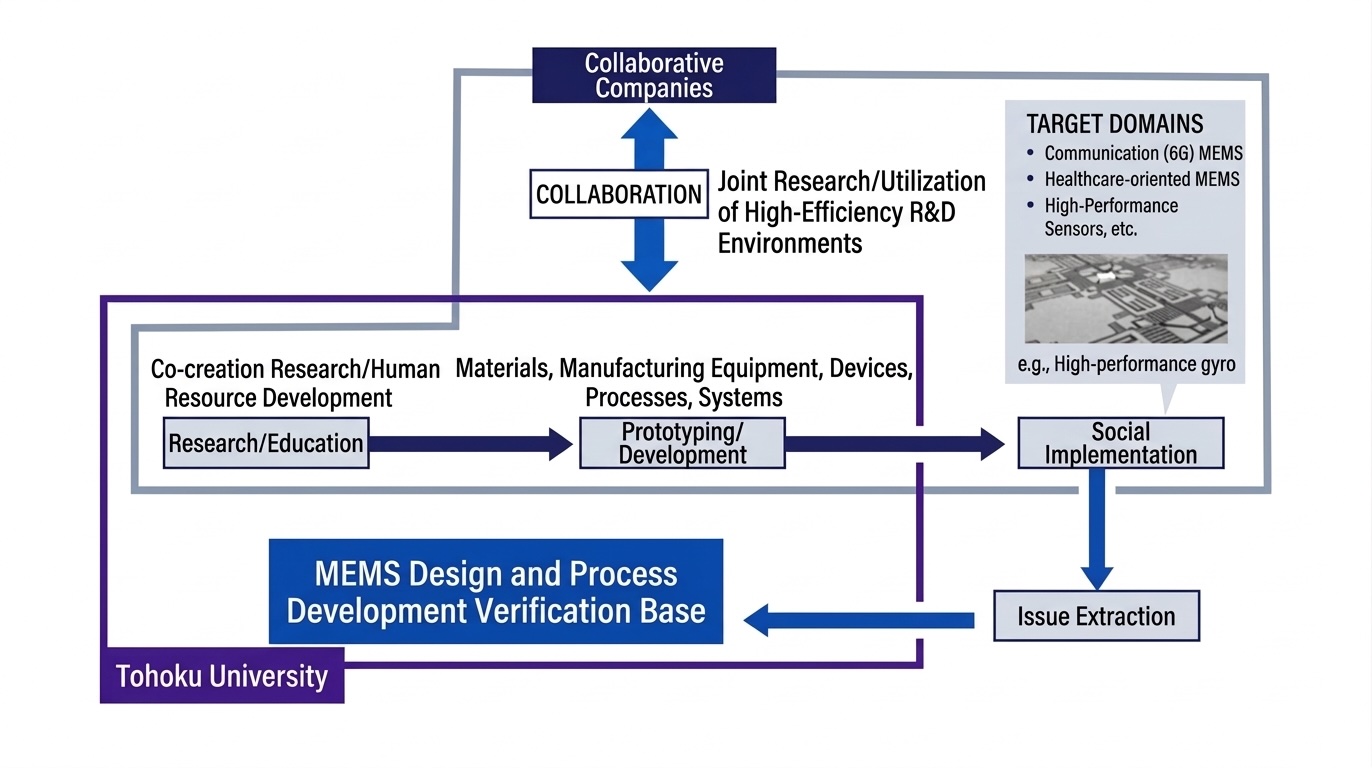 This hub promote MEMS R&D from basic research to social implementation based on industry-academia-government co-creation by utilizing Japan's largest and world-class MEMS R&D resources Using an open prototype manufacturing equipment that supports small pieces up to 200 mm, it is possible to proceed research and development for various purposes such as MEMS, high-frequency devices, and optical devices.