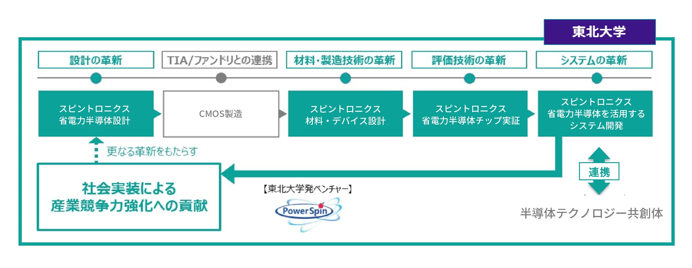 本拠点は、スピントロニクス省電力半導体開発における世界で唯一 の 300mm プロセス対応 R&D 施設です。設計・材料・デバイス・チッ プ実証・システム化までを一貫して開発できます。これにより、世界を先導する省電力技術である消費電力 1/100 のスピントロニクス ロジック半導体とその応用システム開発で世界を先導します。